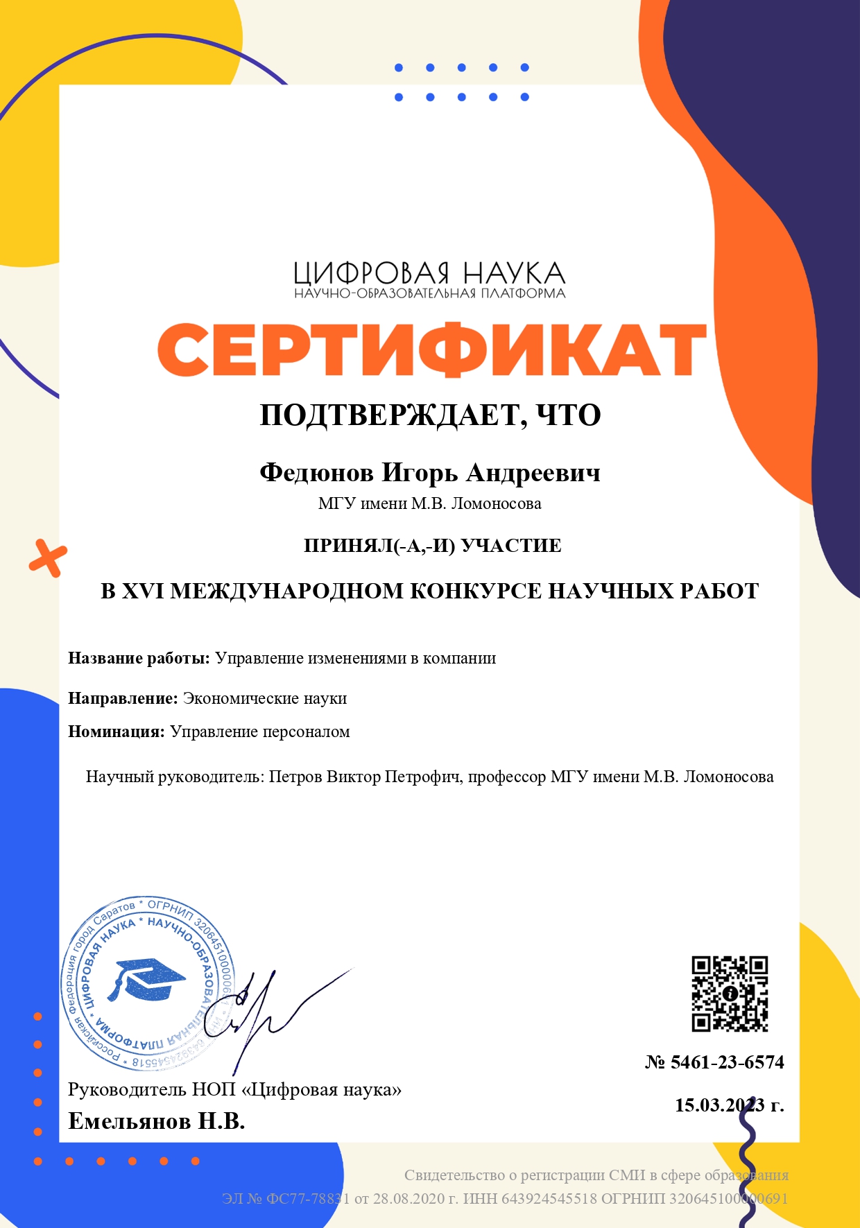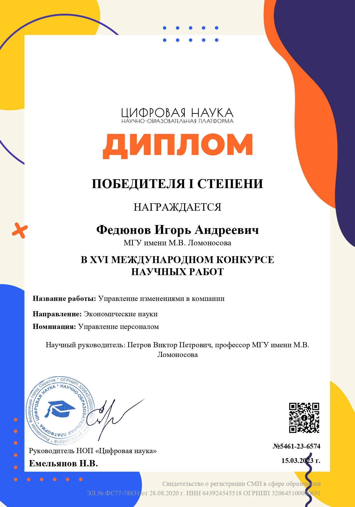 Научно-образовательная платформа «Цифровая наука» объявляет о проведении в 2023 году XVI Международного конкурса научных работ в номинациях: